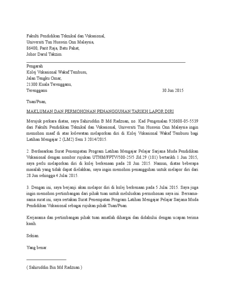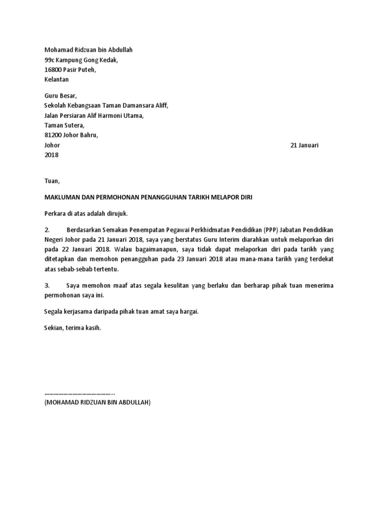 Surat penangguhan lapor diri. Untuk memohon penangguhan apa yang perlu anda lakukan ialah. Anda juga dinasihatkan untuk melaporkan diri terlebih dahulu dan minta jasa baik Guru Besar Pengetua untuk memberikan anda penangguhan memulakan tugas di tempat baru.