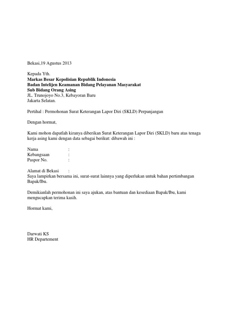 Pelajar semester 23 dan 4 yang diluluskan permohonan kembali ke kampus. Surat rasmi lewat lapor diri surat rasmi laporan format surat rasmi surat rasmi permohonan surat rasmi berhenti kerja cara menulis surat rasmi surat rasmi tidak hadir ke sekolah contoh surat rasmi contoh format surat rasmi surat rasmi. SKLD is an acronym for Surat Keterangan Lapor Diri.